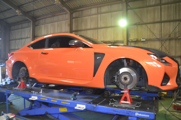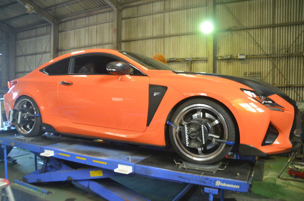 レクサス RC-F でご来店頂き四輪アライメント調整と1G締め直しのご依頼です。