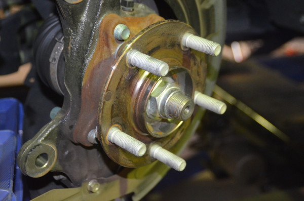 キャリパー、ローターを外してカットしたハブボルトを抜いて新品ボルトを圧入。