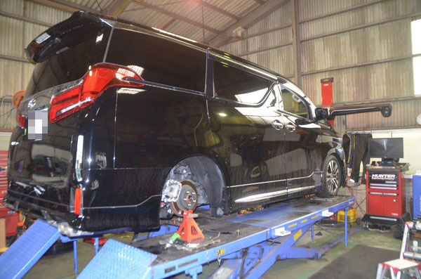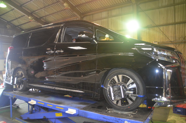 30系アルファードでご来店頂き1G締め直しと四輪アライメント調整のご依頼です。