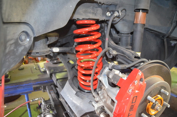 サスペンションを外して純正のスプリングからタナベのUP210に交換。