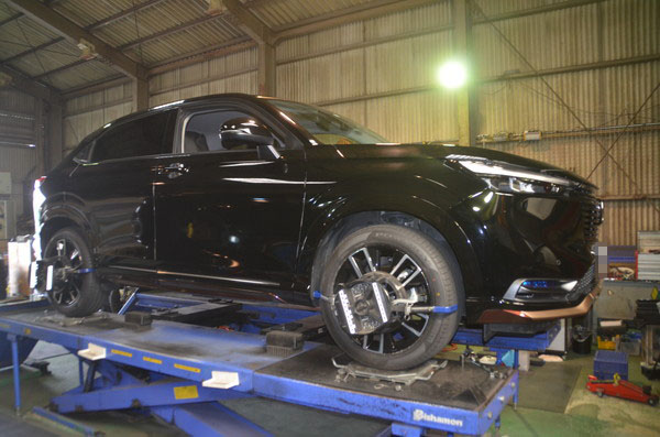 ヴェゼルハイブリッドでご来店頂き1G締め直しと四輪アライメントのご依頼です。