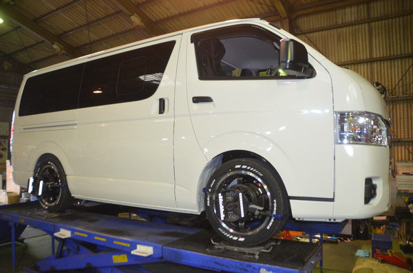 200系 ハイエースでご来店頂き1G締め直しと四輪アライメントのご依頼です。