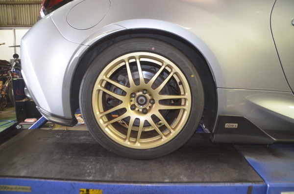 このTOM’Sのサイドエアロは当店のリフトでは上げられないので困りますね。