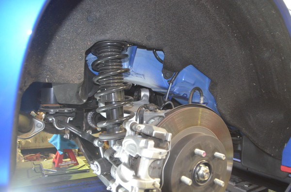 リアもフロント同様に車両から足回りを外してアッパーマウントにスペーサーを装着。