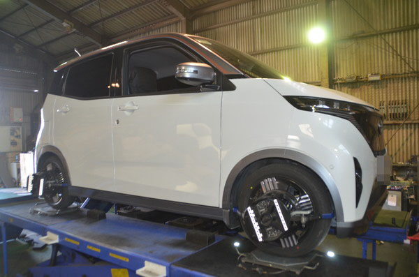 日産 サクラでご来店頂き四輪アライメント調整のご依頼です。
