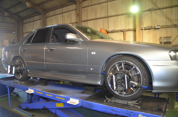 ER34 スカイラインでご来店頂き四輪アライメント調整のご依頼です。